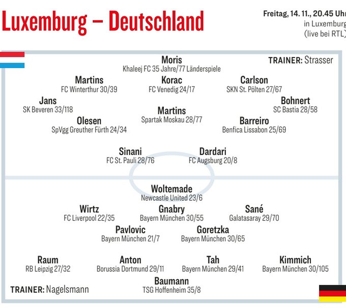 6686 Sports đưa tin vào ngày 13 tháng 11 rằng ở Vòng bảng châu Âu của Giải đấu vòng loại World Cup, đội tuyển Đức sẽ thách đấu đội Luxembourg trên sân khách. Trước trận đấu, hãng truyền thông thể thao Đức “Kicker” đã dự đoán đội hình xuất phát của đội tuyển Đức trong trận đấu này. Trong số đó, số 5 Walter Mader đang chơi cho Newcastle xuất hiện ở vị trí mũi tên đơn. Wirtz, người từng gặp khó khăn ở Liverpool, có cơ hội đá chính và xuất hiện ở vị trí tiền đạo trái. Sane trở lại đội tuyển quốc gia xuất hiện ở vị trí tiền đạo phải.