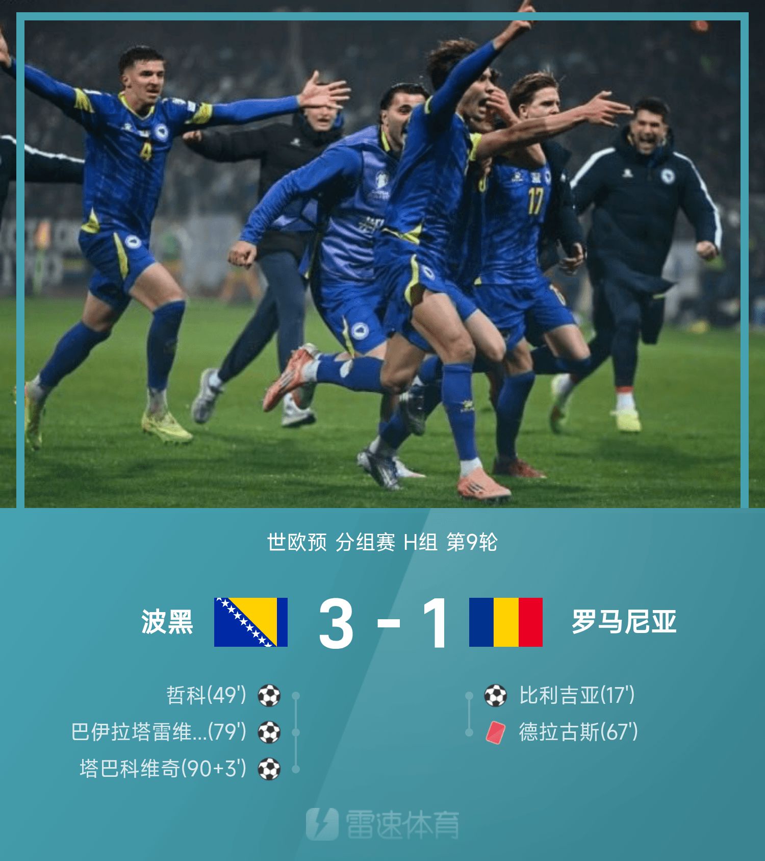 6686 Sports đưa tin ngày 16/11 rằng ở lượt 9 bảng H Vòng loại khu vực châu Âu thế giới lần thứ 26, Bosnia và Herzegovina gặp Romania trên sân nhà. Trong hiệp một, Romania khởi đầu tuyệt vời khi Villagia ghi bàn thắng. Sang hiệp 2, Bosnia và Herzegovina bắt đầu phát huy sức mạnh, Dzeko gỡ hòa bằng pha chọc khe của thủ môn. Dragus đã bị đuổi khỏi sân vì vi phạm nghiêm trọng luật lệ sau hai phút thi đấu. Mười người của Romania đối đầu với Bosnia và Herzegovina. Phút 79, Bajlatarevich ghi bàn lật ngược tình thế, Tabakovic ghi bàn ấn định trận đấu. Villagia không ghi được bàn thắng và cứu được vị cứu tinh. Chung cuộc, Bosnia và Herzegovina đánh bại Romania 10 người với tỷ số 3-1.