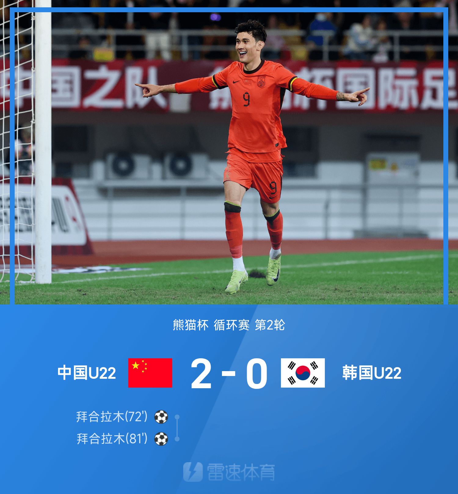 6686 Bản tin thể thao ngày 15/11 Ở trận đấu thứ hai vòng tròn Panda Cup mùa giải thứ 25, U22 Trung Quốc gặp U22 Hàn Quốc. Trong hiệp một, Xu Bin mắc lỗi và suýt chút nữa đã tặng quà, Jin Yonghak đã bỏ lỡ cơ hội; trong hiệp hai, bàn thắng của Li Zhenquan bị gọi là việt vị. Baihe Lamu đầu tiên khai thông thế bế tắc bằng một cú sút chìm, sau đó ghi hai bàn bằng gót chân. Chung cuộc, U22 Trung Quốc đánh bại U22 Hàn Quốc với tỷ số 2-0.