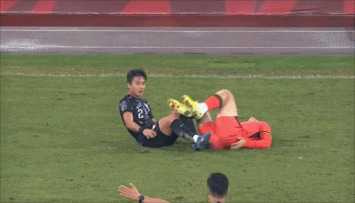 80' Chen Zeshi thực hiện thêm động tác sau khi ngã xuống sân xuống sân và trọng tài rút thẻ cảnh cáo