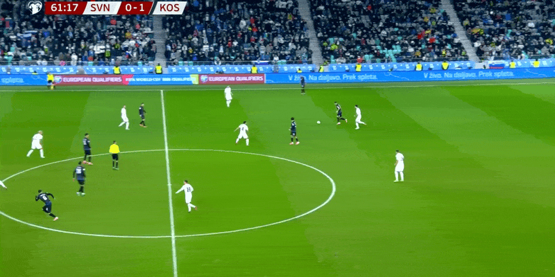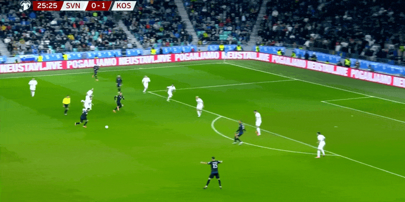 11’ Hậu vệ Kosovo phạm lỗi phá bóng, cú sút của Vipotnik đã bị cản phá