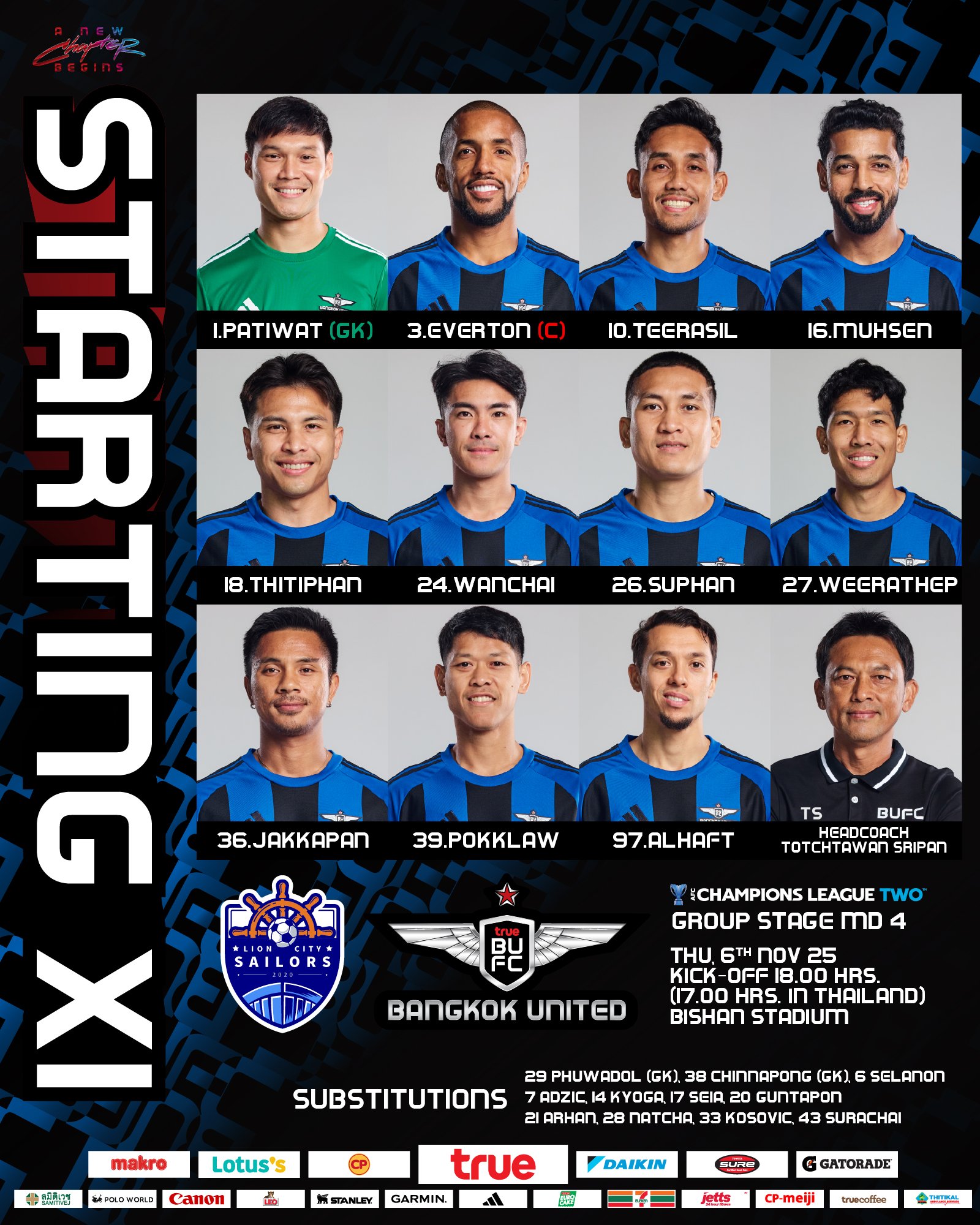 18h ngày 6/11 theo giờ Bắc Kinh, ở lượt trận thứ 4 vòng bảng hạng hai AFC Champions League, đội chủ nhà Lion City Mariners đối đầu Bangkok United. Đội hình xuất phát đã được công bố trước trận đấu.