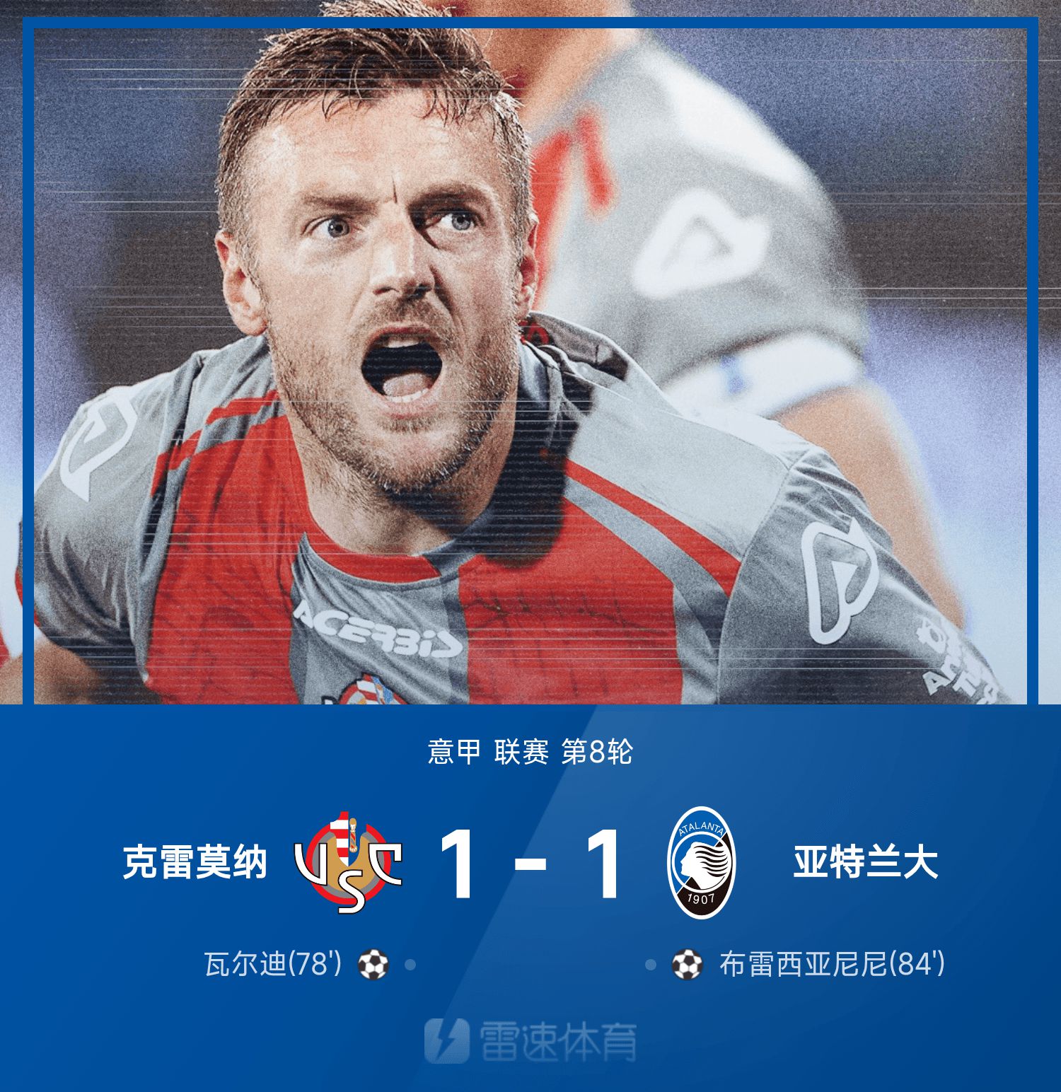 6686 Thể thao ngày 26 tháng 10 Ở vòng 8 vòng 25/26 Serie A mùa giải, Cremona hòa Atlanta 1-1. Phút 78 của hiệp hai, Vardy băng lên ghi bàn, ghi bàn thắng đầu tiên trong sự nghiệp ở Serie A, giúp Cremona vượt lên dẫn trước. Phút 84, Brescianini ghi bàn giúp Atlanta gỡ hòa và mang về một điểm cho đội khách.