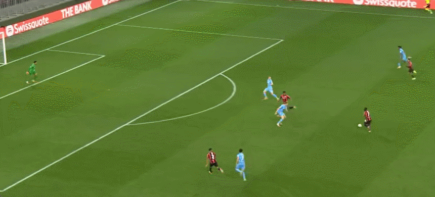 6' Genter phá bóng bằng chân to ngoài khu vực 3 giây, bóng đập vào Boga và bật ra khỏi cột dọc