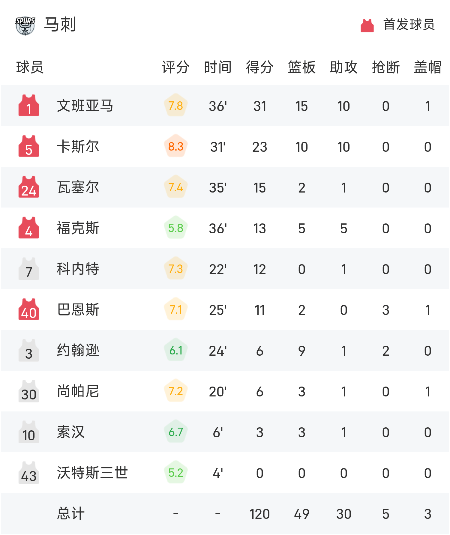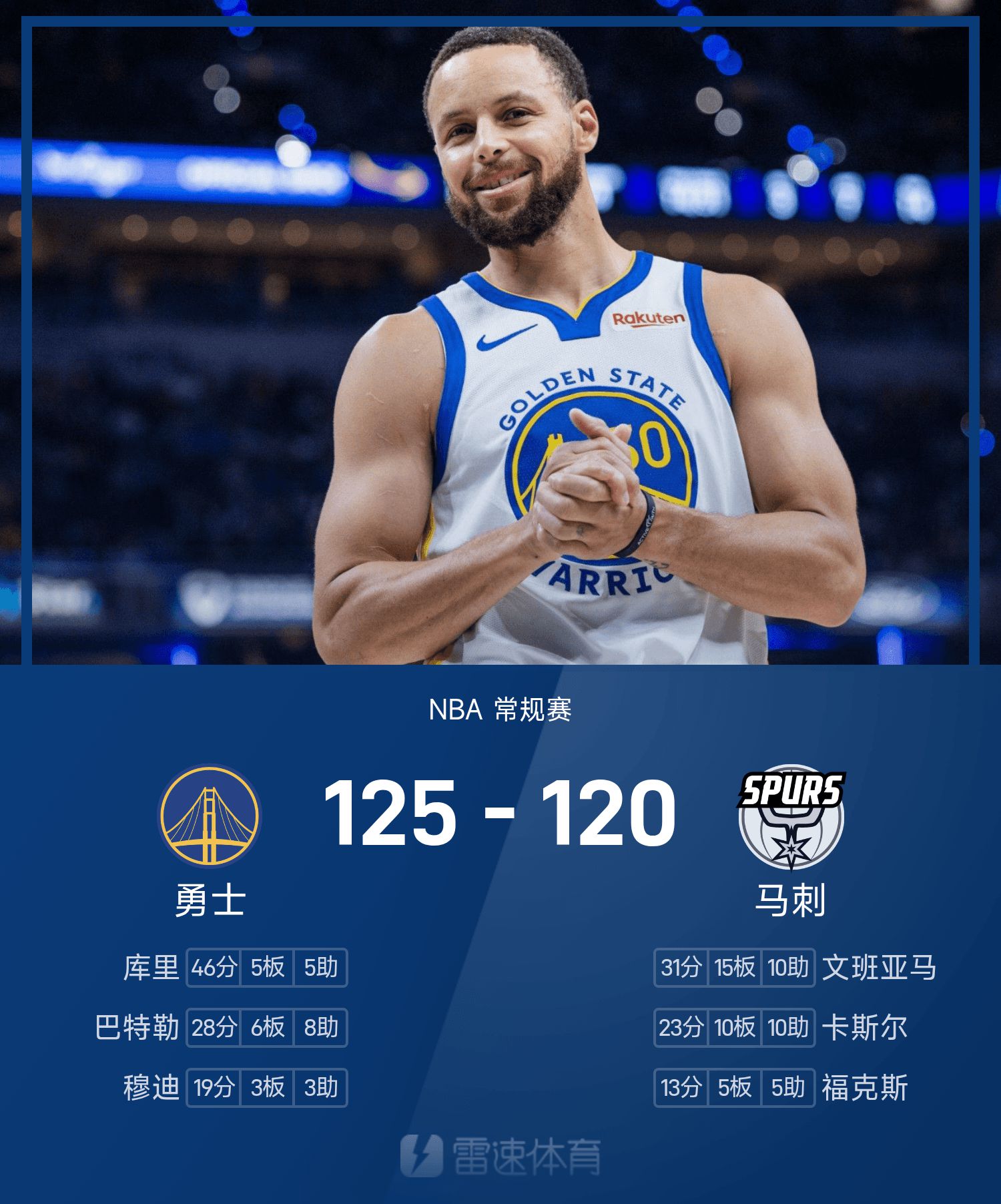 Báo cáo trận đấu NBA: Curry ghi 46 điểm, Wenban lập triple-double, Warriors 125-120 Spurs