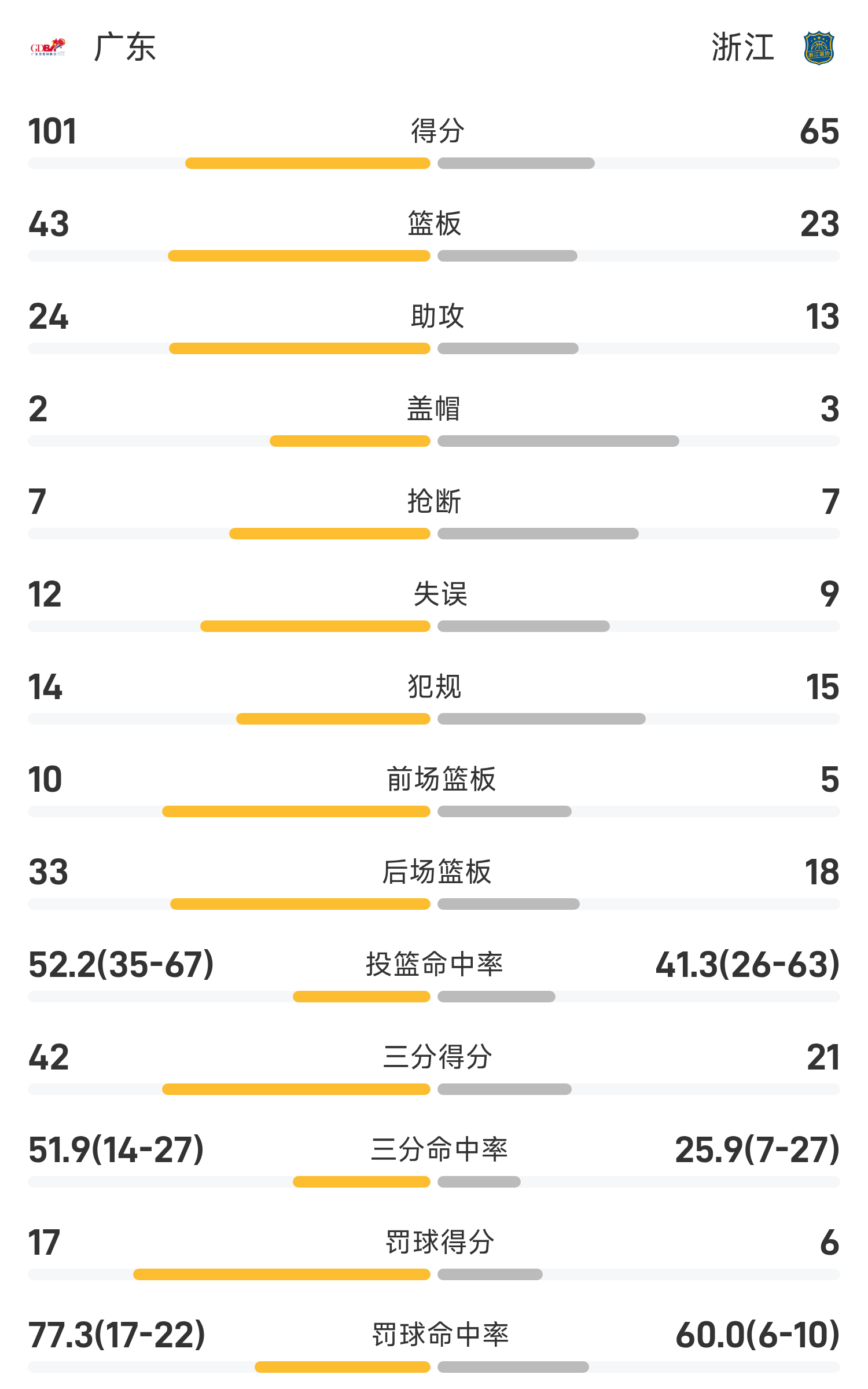 Cuối trận, Chiết Giang thua Quảng Đông với tỷ số 65-101.