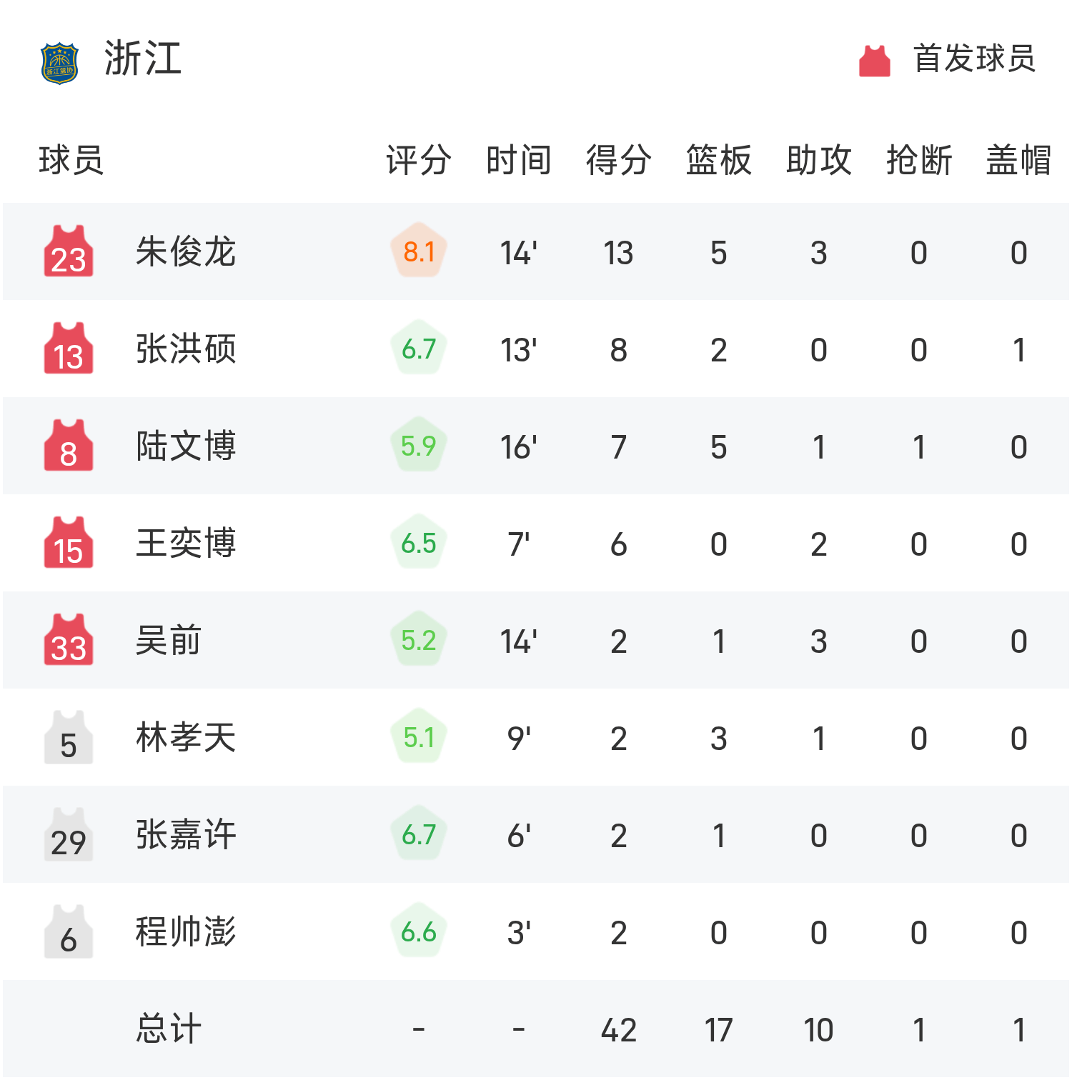 Cầu thủ dự bị của Quảng Đông Xu Jie ghi được 15 điểm, 1 rebound và 2 kiến tạo, còn tiền đạo xuất phát Zhu Junlong của Chiết Giang ghi được 13 điểm, 5 rebound và 3 kiến tạo.