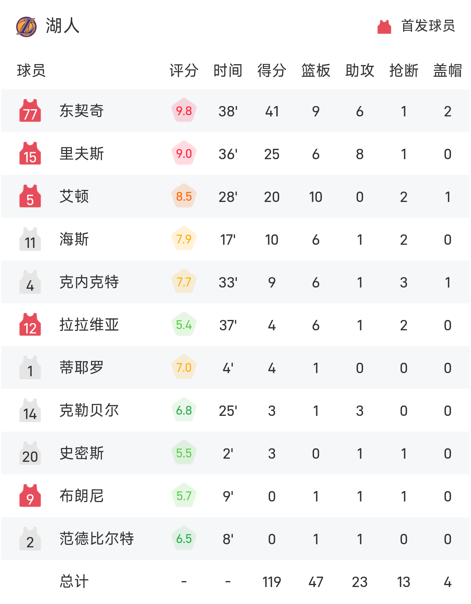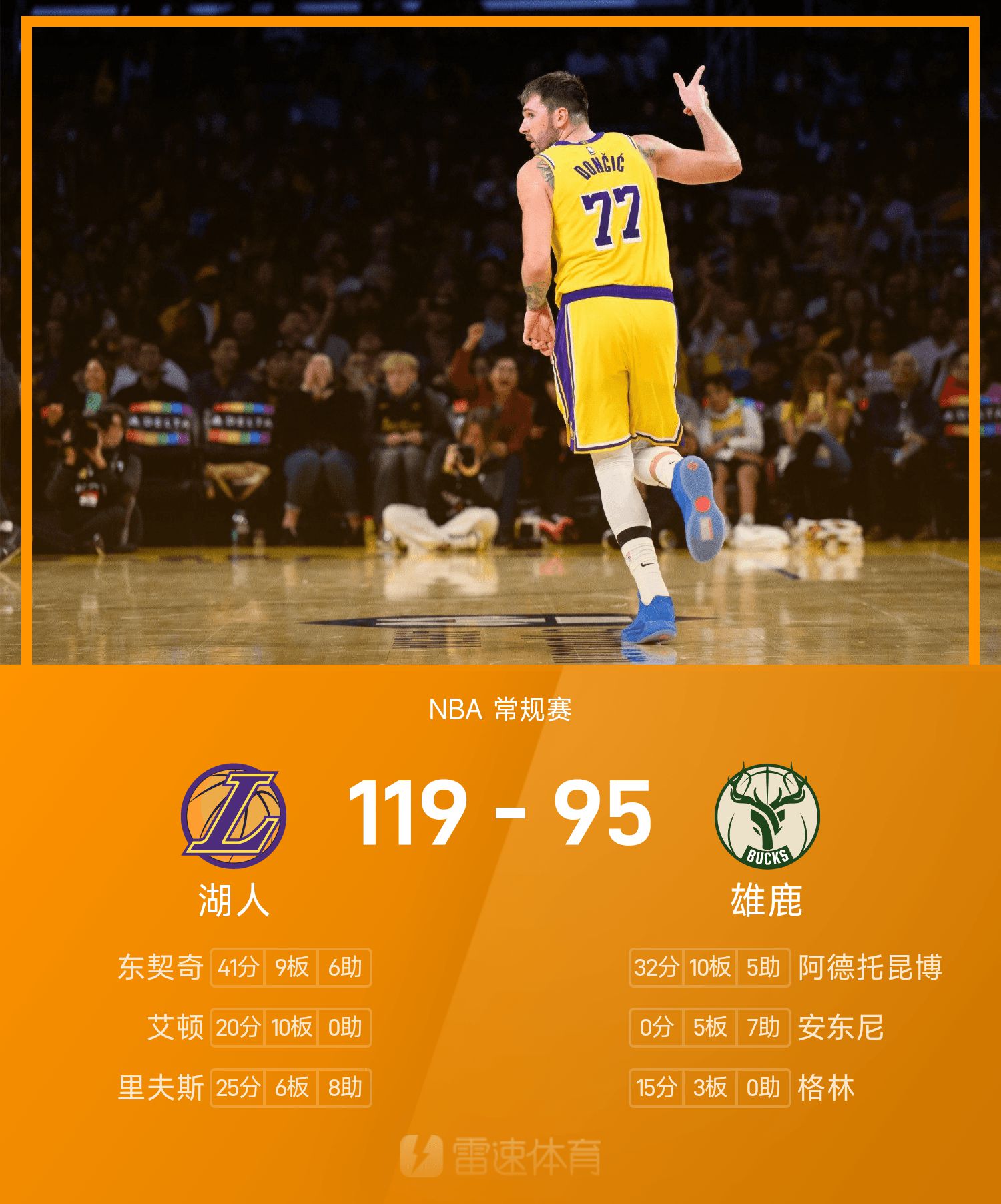 Doncic ghi được 41 điểm cao nhất trận, 9 rebound và 6 kiến tạo, đưa Lakers đến chiến thắng. Antetokounmpo ghi 32+10 một cách vô ích.