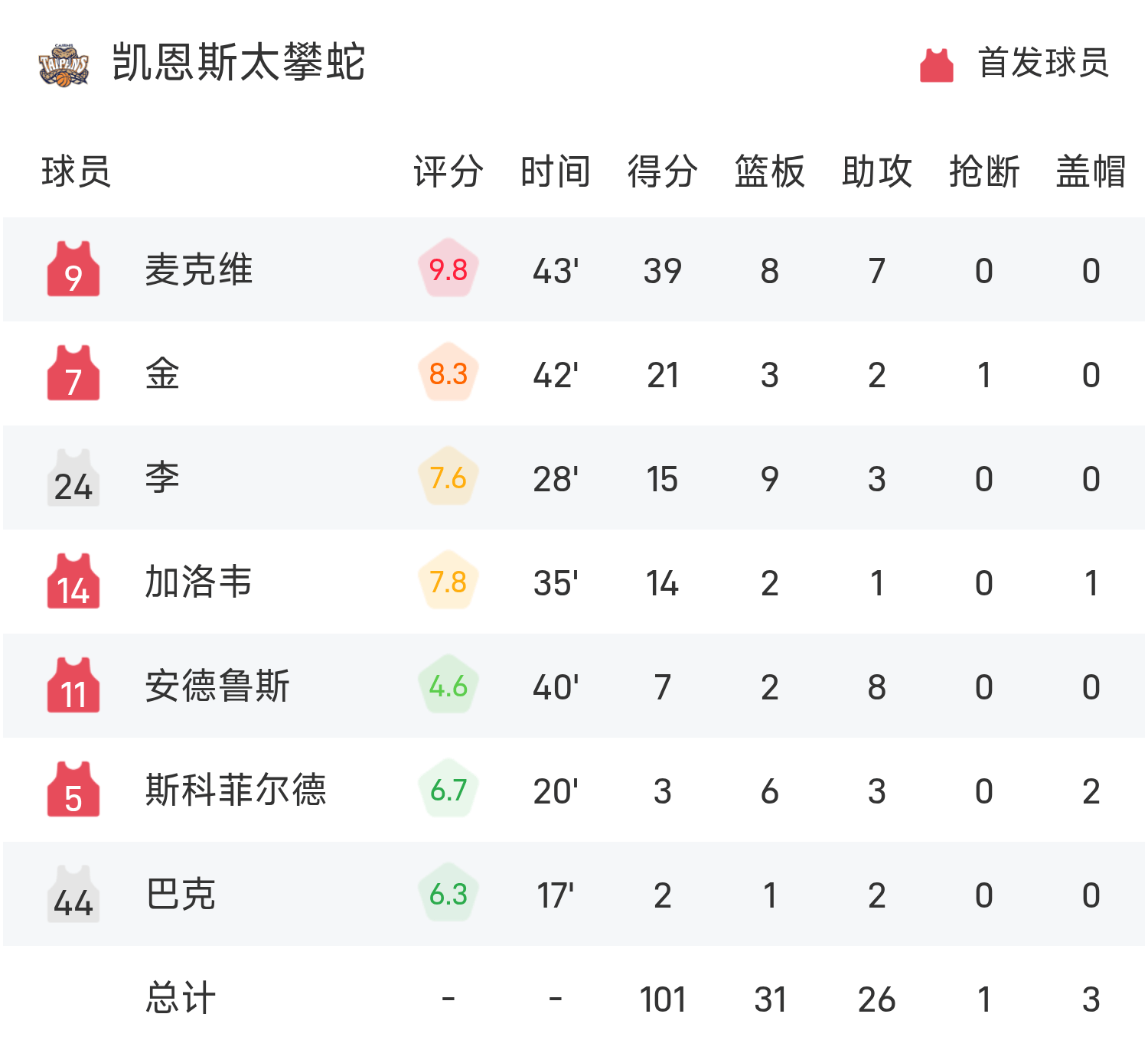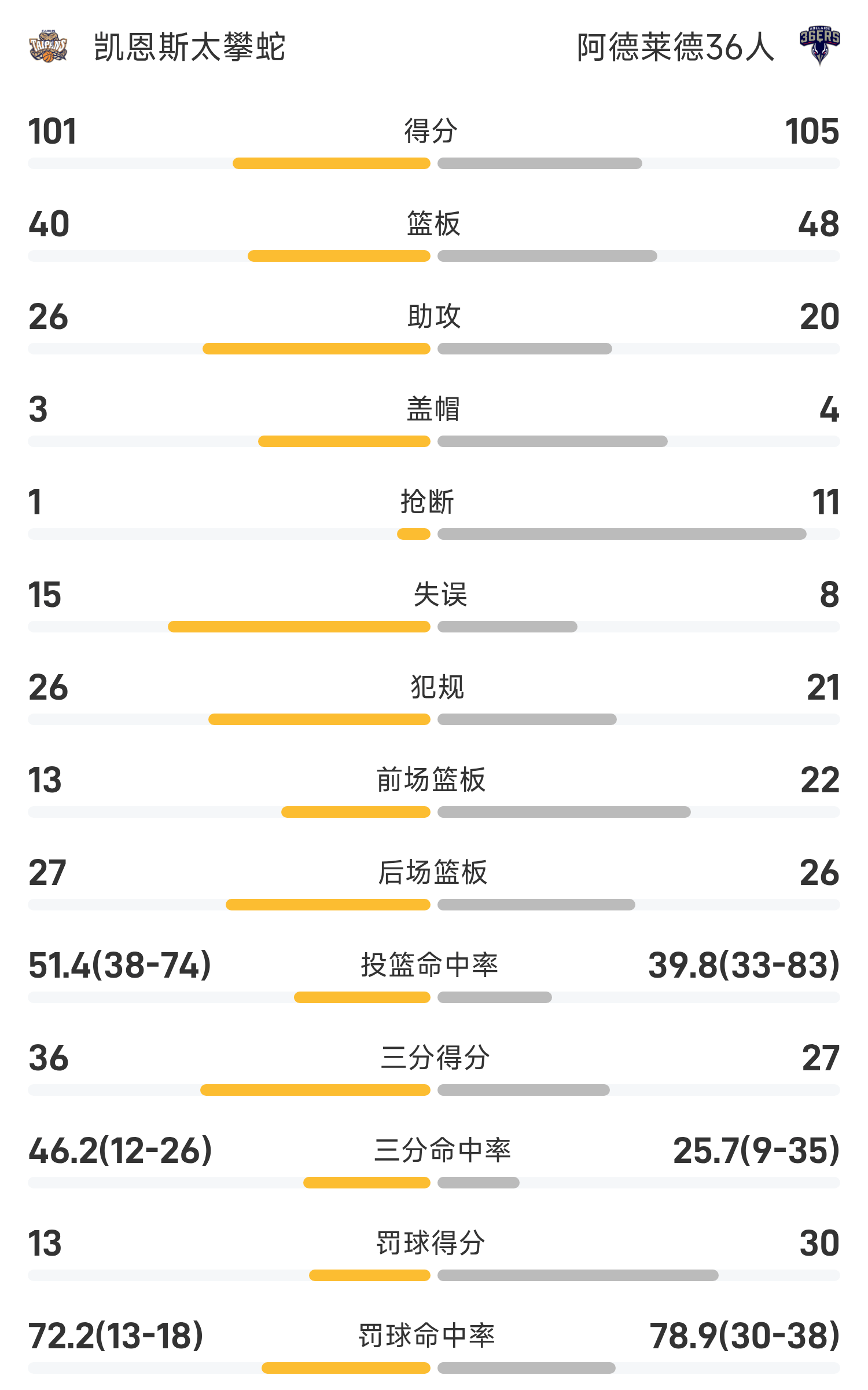 Kết thúc trận đấu, 36 cầu thủ của Adelaide đã đánh bại Cairns Taipan Snakes với tỷ số 105-101.