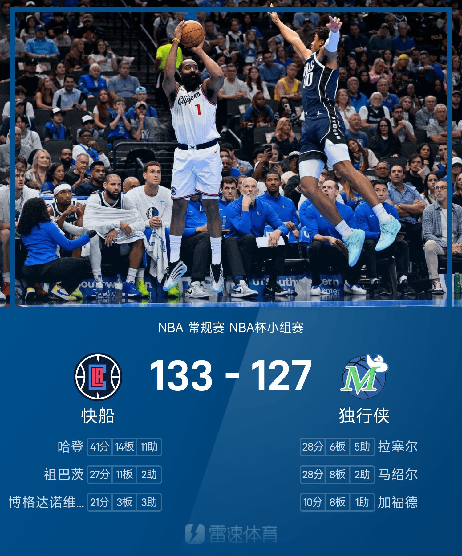 Báo cáo NBA Cup: Harden 41 điểm triple-double, Clippers đánh bại Mavericks 133-127 trong hiệp phụ gấp đôi