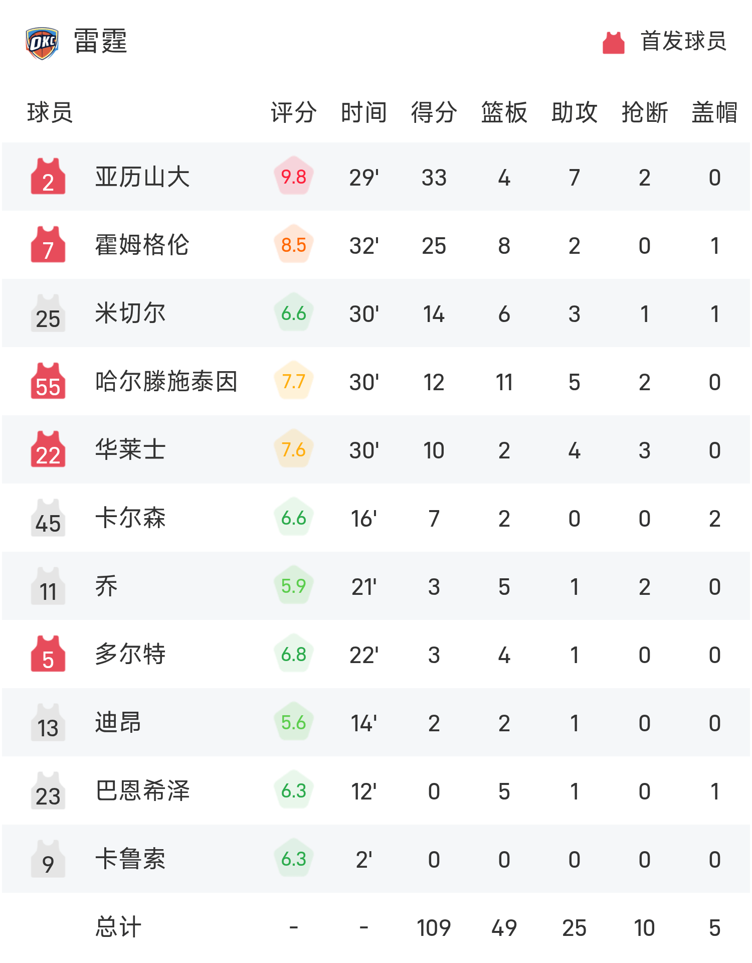 Alexander ghi được 33 điểm cao nhất trận, 4 rebound và 7 kiến tạo, đưa Thunder đến chiến thắng.