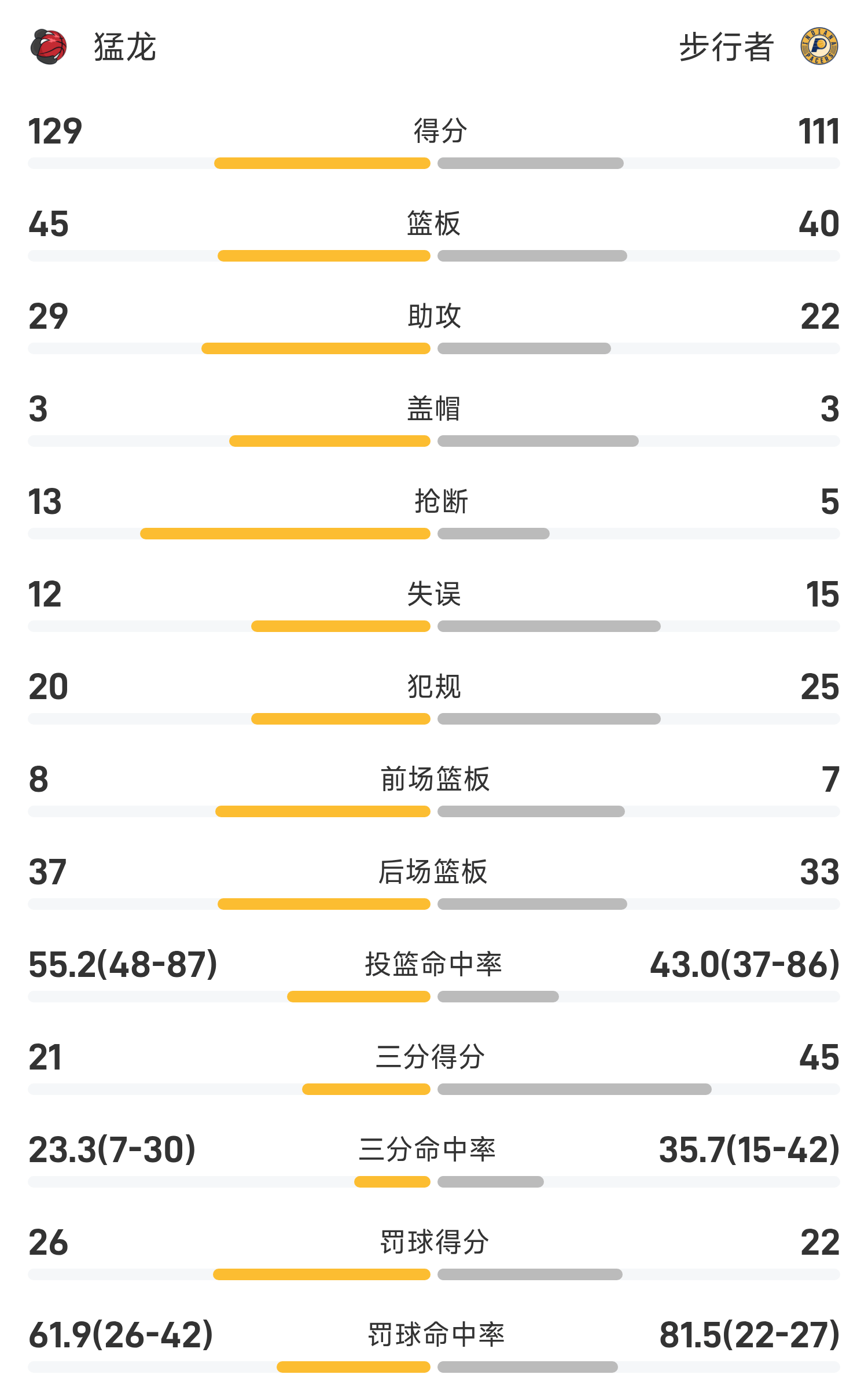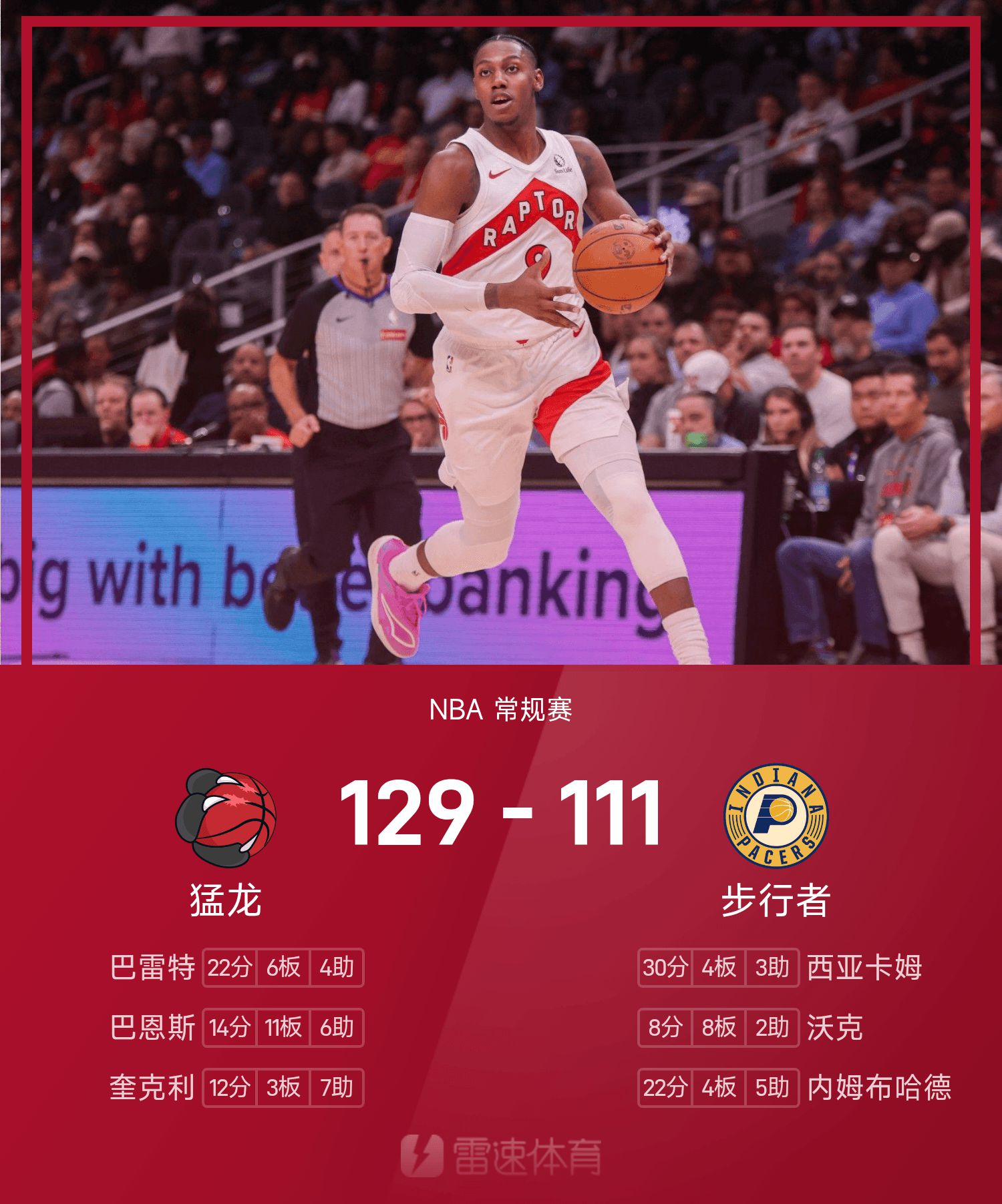 Cuối trận, Pacers thua Raptors với tỷ số 111-129.