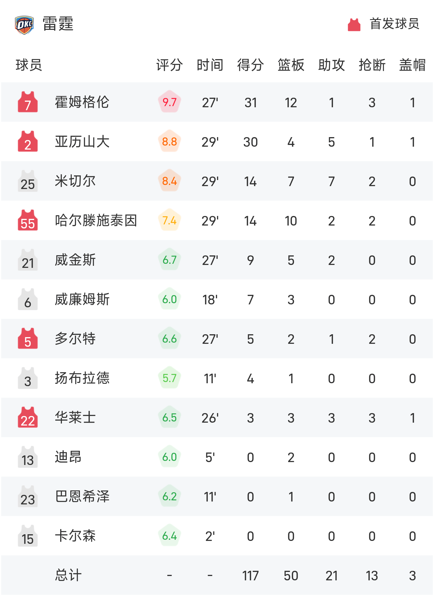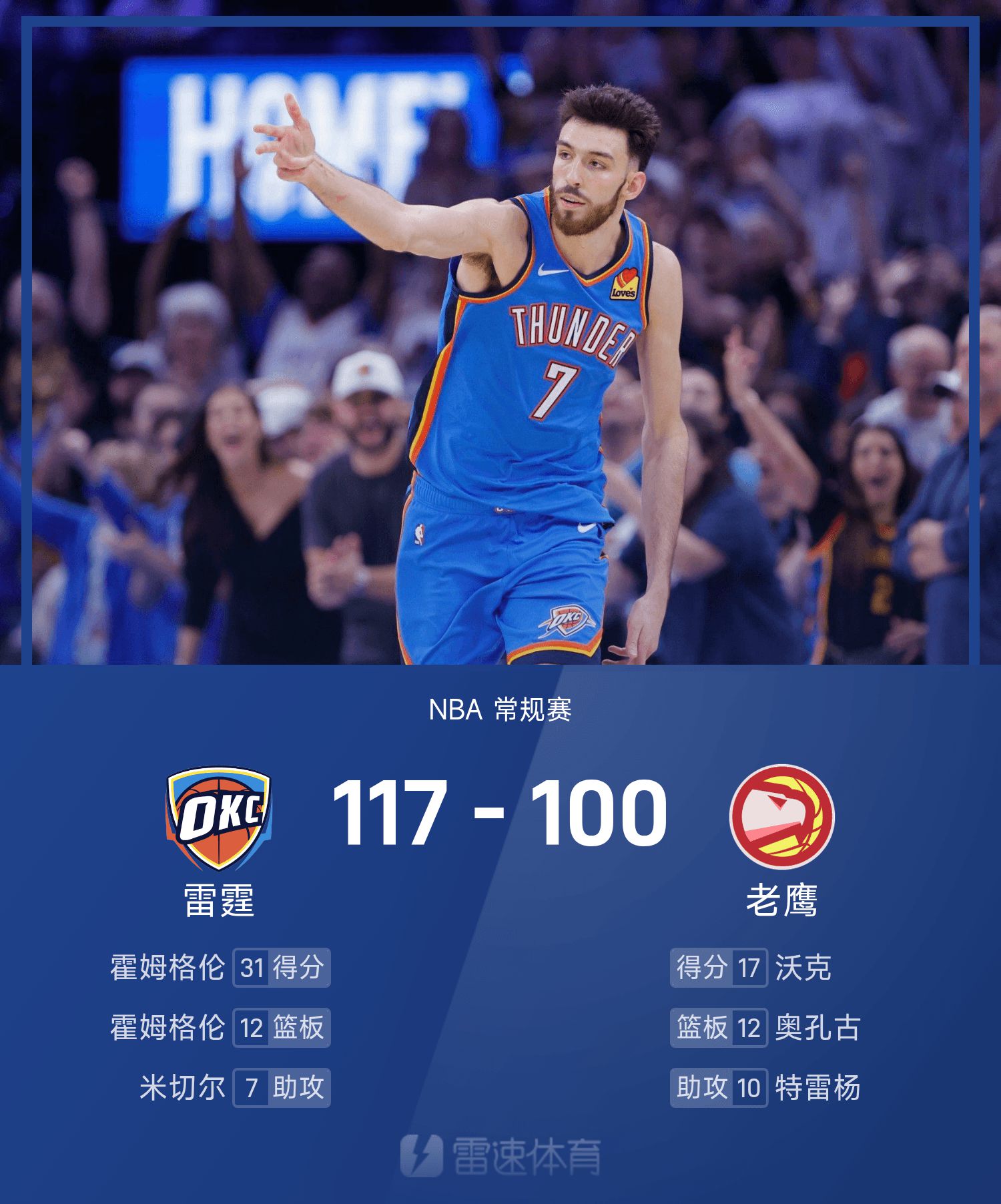 Holmgren ghi được 31 điểm cao nhất trận, 12 rebound và 1 kiến tạo, đưa Thunder đến chiến thắng.